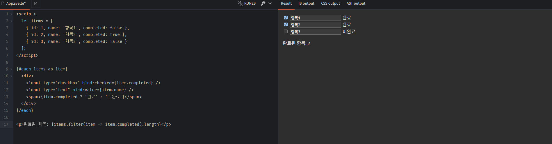 <p>μλ£λ νλͺ©: {items.filter(item => item.completed).length}</p>