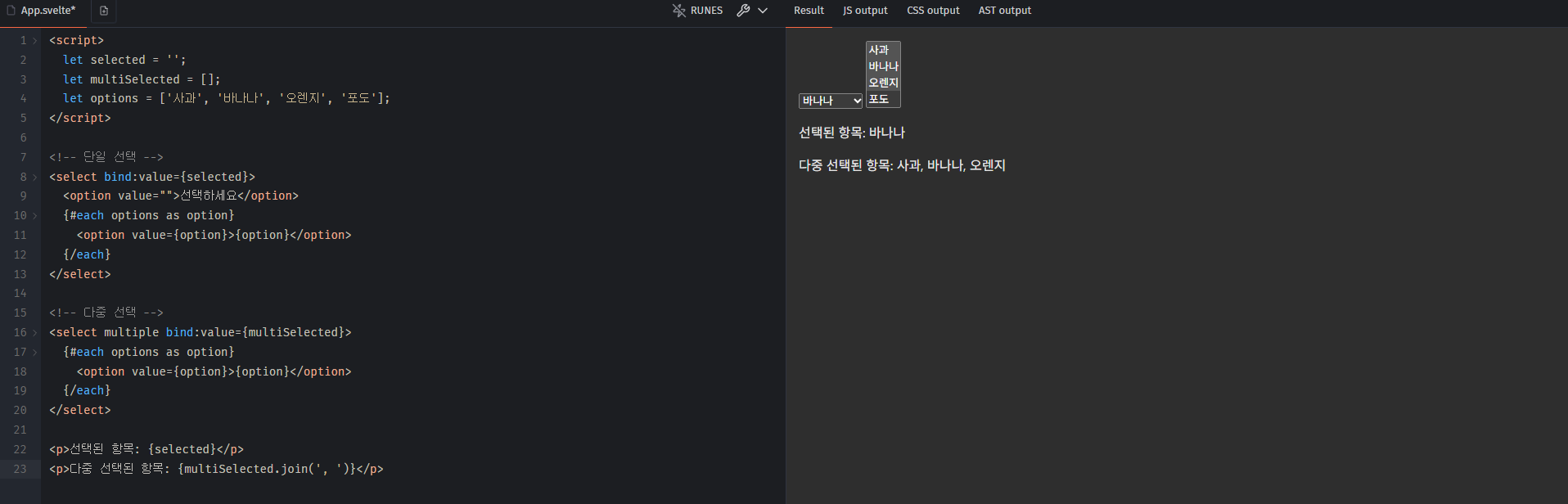 select μμμμ λ¨μΌ μ νκ³Ό λ€μ€ μ ν λͺ¨λ bind:valueλ‘ μ²λ¦¬ν μ μλ€.