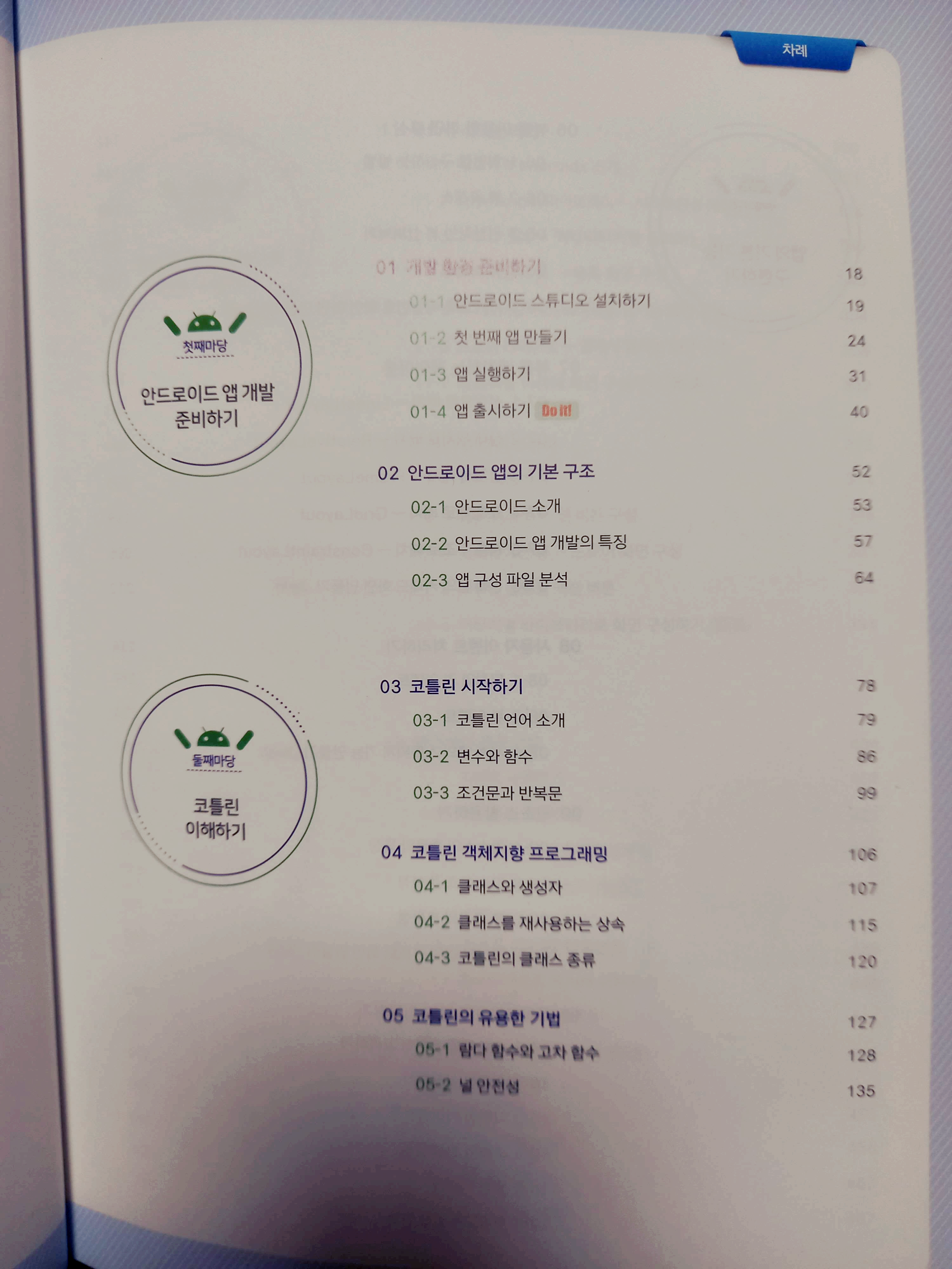 ๋ชฉ์ฐจ๋ฅผ ๋ณด์๋ง์ ์ฑ ๋๊ป๊ฐ ์กฐ๊ธ์ ์ดํด๊ฐ ๋์์ต๋๋ค. ์ฑ ์ ๋ชฉ๋ง ๋ณด์์ ๋ ์ฝํ๋ฆฐ ์ ๋ชจ๋ฅด๋๋ฐ ์ฝํ๋ฆฐ ๋ฒ ์ด์ค ์ฑ ํ๋ก๊ทธ๋๋ฐ ๊ด์ฐฎ์๊น ๊ฑฑ์ ์ด์๋๋ฐ, ์ฝํ๋ฆฐ ๊ฐ๋ ๋ถํฐ ์ง๊ณ ์์ํฉ๋๋ค. ์ธ์ด๋ฅผ ๊น๊ฒ ๋ค๋ฃจ์ง๋ ์์ง๋ง, ์ฝํ๋ฆฐ ๊ธฐ๋ณธ ๊ฐ๋ ์ ์๊ณ ์ฌ์ฉํ๊ธฐ์๋ ๋ฌด๋ฆฌ์์ ์ ๋์ ๊ตฌ์ฑ์ด์์ต๋๋ค. ์ฝํ๋ฆฐ ๊ฐ๋ , ๊ฐ๋ฐ ํ๊ฒฝ ์ธํ ๋ฑ ์์ฃผ ๊ธฐ๋ณธ์ ์ธ ๋ด์ฉ๋ถํฐ ์์ํด์ ์ฑ ๊ธฐ๋ณธ ๊ธฐ๋ฅ ๊ฐ๋ฐ, ๋ผ์ด๋ธ๋ฌ๋ฆฌ ํ์ฉ, ๊ณ ๊ธ ๊ธฐ๋ฅ ์ถ๊ฐ๊น์ง ์๋๋ก์ด๋ ์ฑ ๊ฐ๋ฐ ํ์ต์ ์ํ ๋จ๊ณ์ ์ปค๋ฆฌํ๋ผ์ ์ ๊ณตํฉ๋๋ค. ์ฃผ์ ๋ชฉ์ฐจ๋ ๋ค์๊ณผ ๊ฐ์ต๋๋ค.