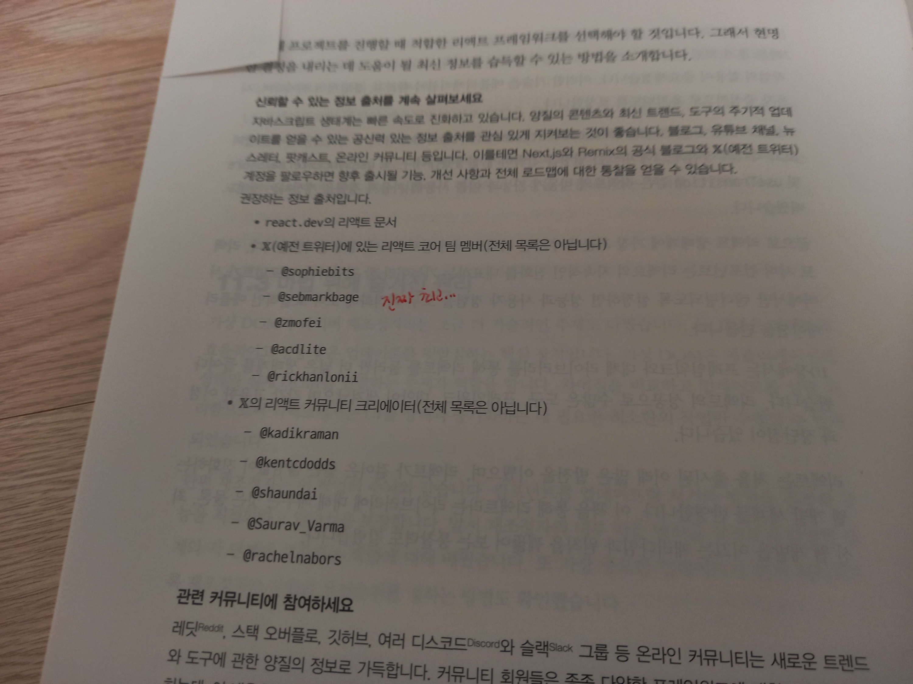 11์ฅ ๋ง์น๋ฉฐ์์๋ ํต์ฌ ์์ฝ์ด ์ ๊ณต๋ฉ๋๋ค. ๋ํ ์ ๋ฐ์ดํธ ์์์ ๋ค์ ์ ์๋ ์ ๋ณด ์ถ์ฒ๋ ์ ๋ฆฌ๋์ด ์๋๋ฐ, ์ด ๋ถ๋ถ์ด ๋๋ฌด ๊ฐ๋์ ์ด์์ต๋๋ค.๋ฆฌ์กํธ ๊ณต์ ๋ฌธ์๋ฟ๋ง ์๋๋ผ, ๋ฆฌ์กํธ ์ฝ์ดํ์ X(๊ตฌ ํธ์ํฐ) ๊ณ์ , ๋ฆฌ์กํธ ์ปค๋ฎค๋ํฐ ํฌ๋ฆฌ์์ดํฐ๋ค์ ๊ณ์ , ๊ทธ๋ฆฌ๊ณ ๋ค์ํ ๊ด๋ จ ์ปค๋ฎค๋ํฐ ์ ๋ณด๊ฐ ์ ๋ฆฌ๋์ด ์์ต๋๋ค. ์ด๋ฐ ์ ๋ณด๋ ํ๋ํ๋ ์ฐพ๋ ๋ฐ๋ ๋ง์ ์๊ฐ์ด ๊ฑธ๋ฆด ํ ๋ฐ, ์ด๋ ๊ฒ ์ ๋ฆฌ๋์ด ์๋ ์ธ์ฌํจ์ด ๊ฐ๋์ ์ด์์ต๋๋ค. ์ฑ ์ ๋ค ์ฝ๊ณ ๋์ด ์๋๋ผ ์ดํ์๋ ์ง์์ ์ผ๋ก ๋ฆฌ์กํธ์ ๋ฐ์ ์ ๋ฐ๋ผ๊ฐ ์ ์๋๋ก ๋์์ค๋ค๋ ์ ์์, ํ์ต์ ๋๋ฐ์ ๊ฐ์ ๋๋์ ๋ฐ์์ต๋๋ค.