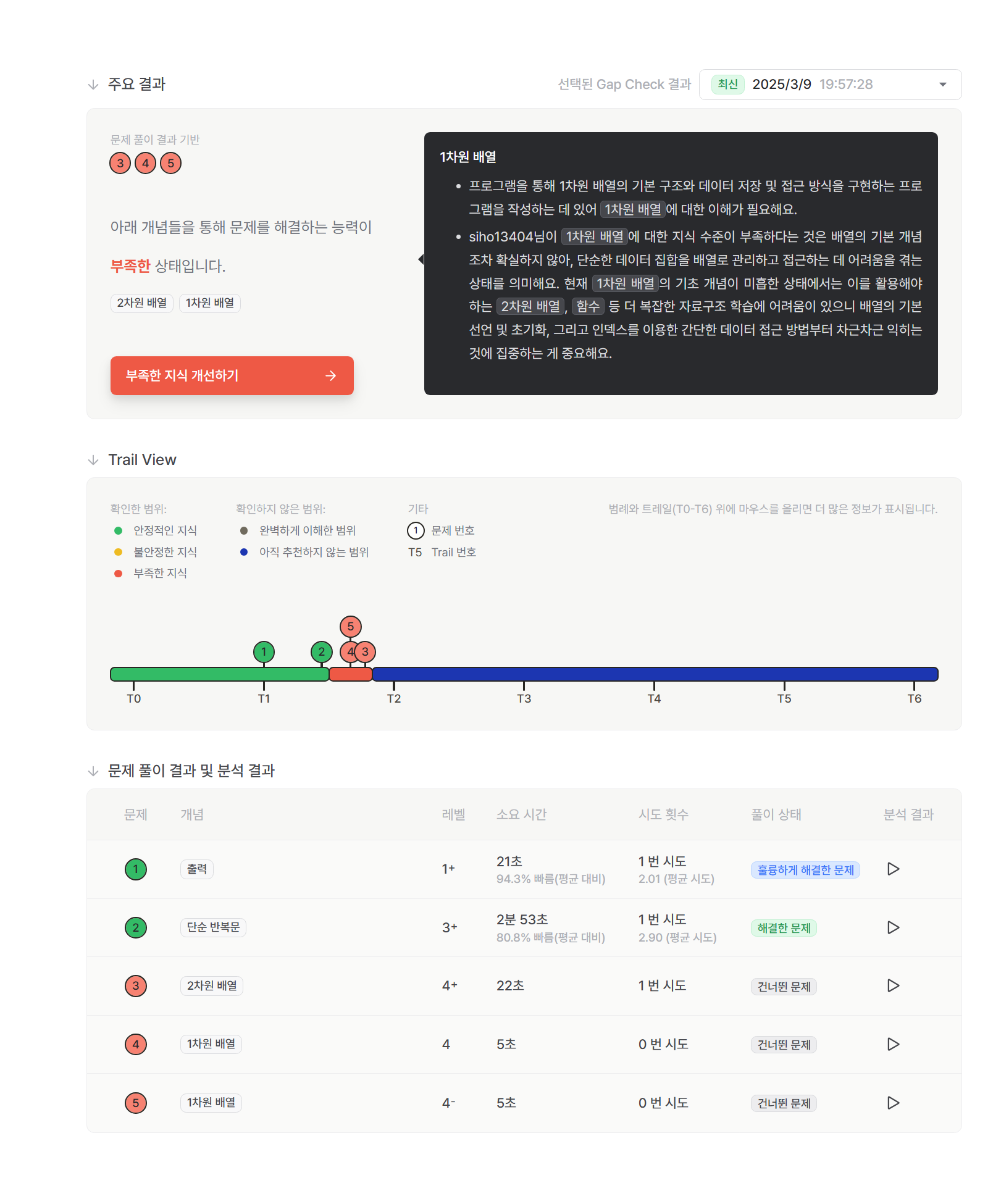 ํ ์คํธ ๊ฒฐ๊ณผ๋ฅผ ๊ธฐ๋ฐ์ผ๋ก ๋ถ์กฑํ ์์ญ๊ณผ trail์ ๋ถ์ํ์ฌ ์ ๊ณตํฉ๋๋ค. ๋ถ์กฑํ ์ง์ ๊ฐ์ ํ๊ธฐ ๋ฒํผ์ ๋๋ฅด๋ฉด, ์ถ์ฒ chapter ํ๋ฉด์ผ๋ก ์ด๋ํฉ๋๋ค. ์ค๋ ฅ์ ํ์ธํ๊ณ ๋ถ์กฑํ ์์ญ๋ถํฐ ํ์ต์ ์์ํ ์ ์์ด ๋งค์ฐ ์ ์ฉํ ๊ธฐ๋ฅ์ ๋๋ค.